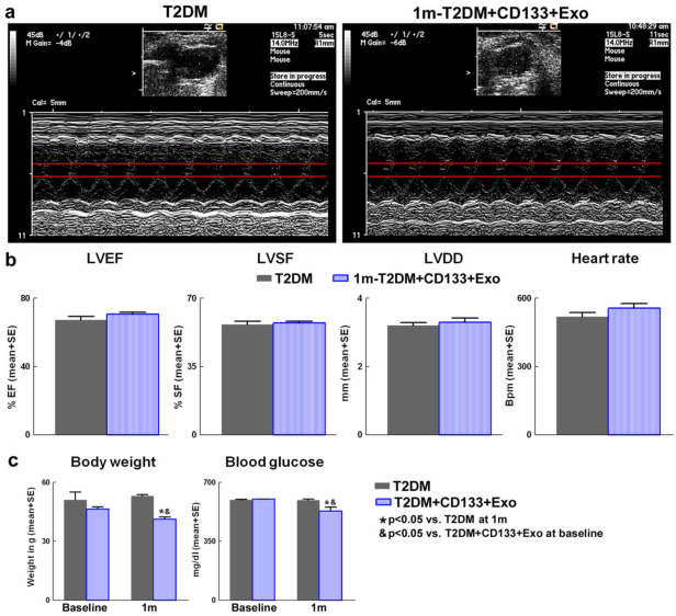 Fig.3 CD133+Exo处理可降低T2DM小鼠的体重和血糖,但不能改善心功能