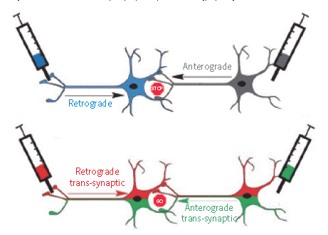 神经元是具有极性的细胞,信息从上一级神经元的轴突通过突触传递到下一级神经元的树突,之后发生树突、胞体的信息整合,并通过轴突再次发出。因此涉及神经环路的标记包括方向性(顺向:胞体至轴突的标记;逆向:轴突至胞体的标记)和是否跨突触两大基本问题(图1)。