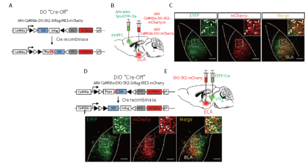 载体:AAV2/1-retro-Syn-eYFP-Cre、AAV2/8-CaMKIIα-DO-SK2&AAV2/8-CaMKIIα-DIO-SK2-mCherry