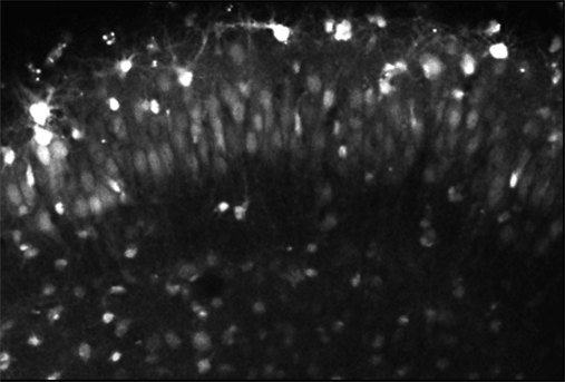 因而,神经元钙离子成像技术的原理就是借助钙离子浓度与神经元活动之间的严格对应关系,利用特殊的荧光染料或者蛋白质荧光探针(钙离子指示剂,Calcium indicator),将神经元中钙离子的浓度通过荧光强度表现出来,并被显微镜捕捉,从而达到监测