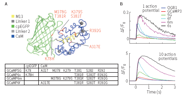 图4 几种不同GCaMP蛋白的特性(Douglas S. Kim, et al., Nature, 2013)