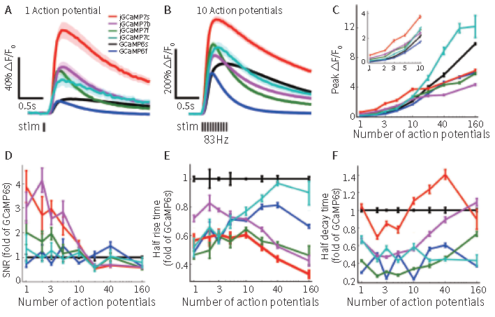 图5 jGCaMP7蛋白的反应特点(Douglas S. Kim, et al., bioRXiv, 2018)
