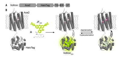 Voltron,是一种新型电压指示剂,不同于传统的GEVIs依赖于微生物视紫红质或荧光蛋白(这些荧光基团缺乏亮度与光稳定性),Voltron利用明亮且耐光型的合成染料。其原理在于Voltron将电压敏感性微生物视紫红质结构域和自标记蛋白标记域结合染料结合,后者可共价结合一种人工荧光染料配体,合成染料给药方式简单,且可跨血脑屏障。体内同时成像神经元的数量扩大10倍,且成像时间更加持久。