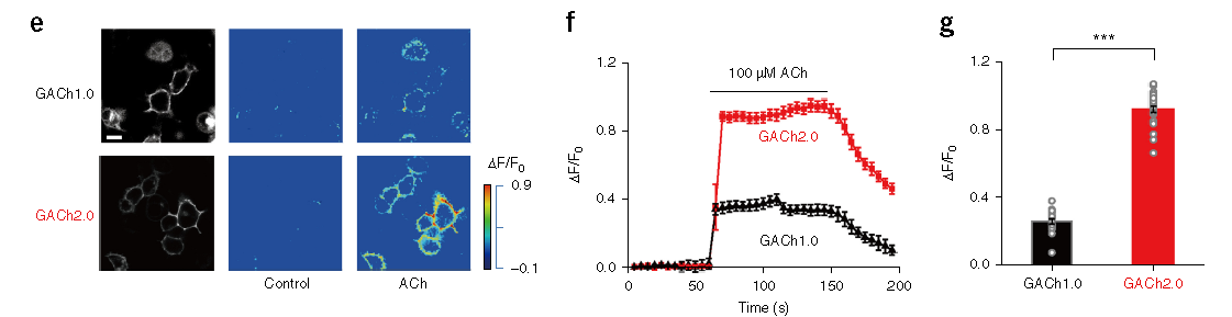 乙酰胆碱是人类发现的第一种神经递质,负责调节睡眠、成瘾、学习记忆等过程。乙酰胆碱信号传递失常,会导致先天性肌肉萎缩、糖尿病、阿兹海默症等疾病。GACh2.0对生理浓度乙酰胆碱具有高信噪比、高灵敏性的光学信号变化响应,并且具有亚秒级动力学及高度分子特异性,可实现对时空特异性乙酰胆碱信号的精确指征(图12)。
