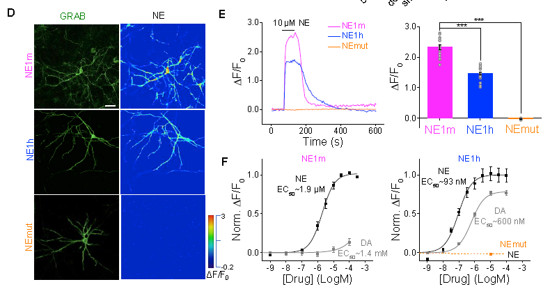 去甲肾上腺素作为一种重要的单胺类神经递质,参与感觉信号的调节、注意力调控、睡眠于觉醒、学习记忆等生理过程,去甲肾上腺素释放或信号传递的受损与一系列的精神疾病和神经退行性病变息息相关。去甲肾上腺素探针包含:NE1m和NE1h两种版本,分别对应高/低亲和力,适用于检测局部突触传递和非局部非突触传递的去甲肾上腺素释放(图13)。