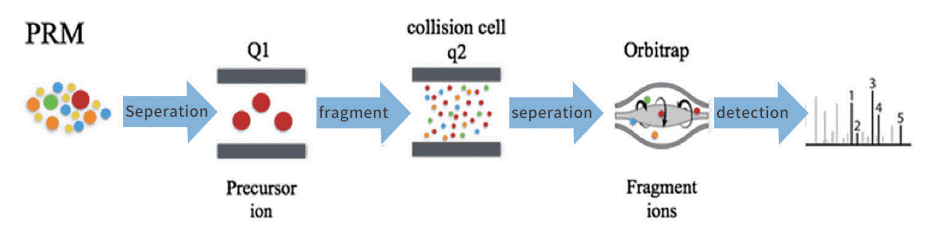 PRM(平行反应监测,Parallel Reaction Monitoring),是目前靶向蛋白质组学数据采集的主流方法,通过对特异性肽段或目标肽段(如发生翻译后修饰的肽段)进行选择性检测,从而实现对目标蛋白质/修饰肽段的靶向相对或绝对定量。PRM可用于组学数据验证,比如基因组/转录组/定量蛋白质组/修饰蛋白质组获得的目标基因/蛋白,实现其相对/绝对定量分析。