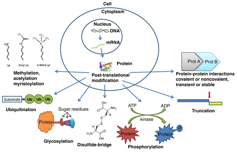 DNA转录成mRNA要再翻译成具有特定氨基酸序列的蛋白质才能在体内发挥功能,其中大部分蛋白质往往还需要经过化学修饰才能具备真正的活性,这种修饰称为蛋白质翻译后修饰 (Protein translational modifications,PTMs)。翻译修饰的过程,就是在蛋白质氨基酸序列中添加特定氨基酸或改变特定化学官能团的过程,进而改变蛋白质的结构。已有实验证明有三百多种潜在的PTM类型,并且同一个蛋白质可能在多个位点发生修饰,这就促成了蛋白结构和功能上的多样性。