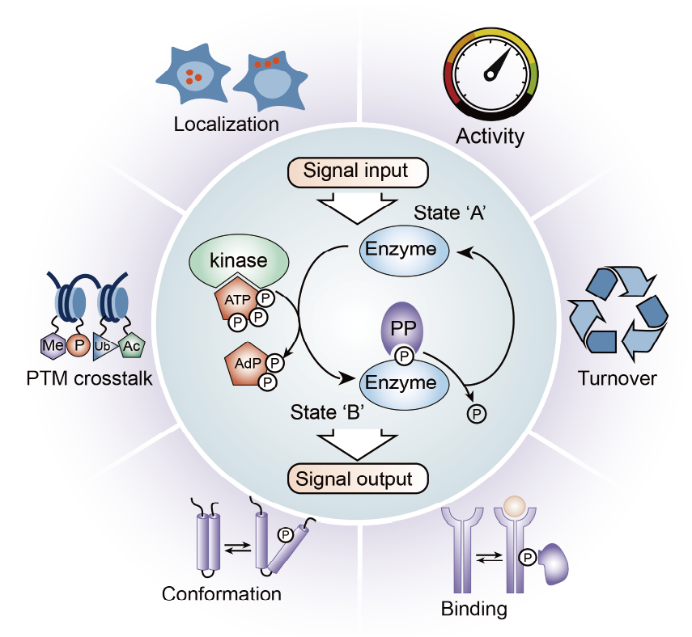 磷酸化蛋白组(Phosphoproteome) 指细胞、组织或生物体中所有被磷酸化修饰的蛋白质及其修饰位点的集合。磷酸化作为最常见的蛋白质翻译后修饰(PTM)之一,通过激酶催化磷酸基团连接到蛋白质的丝氨酸(Ser)、苏氨酸(Thr)或酪氨酸(Tyr)残基上,调控蛋白质的活性、定位、互作及降解,在细胞信号传导、代谢调控、细胞周期、分化和疾病发生中起核心作用。