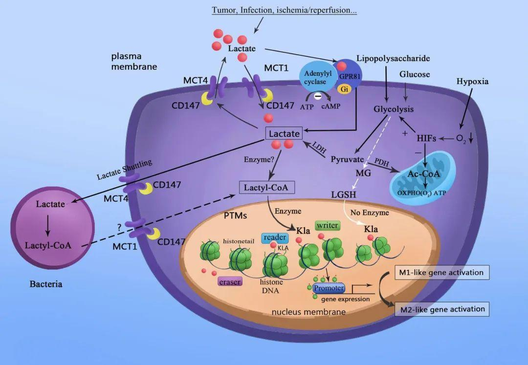 免疫细胞极化调控:M1 型巨噬细胞糖酵解活跃,胞内乳酸化修饰组蛋白 H3K27,抑制抗炎基因(如 IL-10)表达;而 M2 型巨噬细胞以氧化磷酸化为主,乳酸化水平降低。
