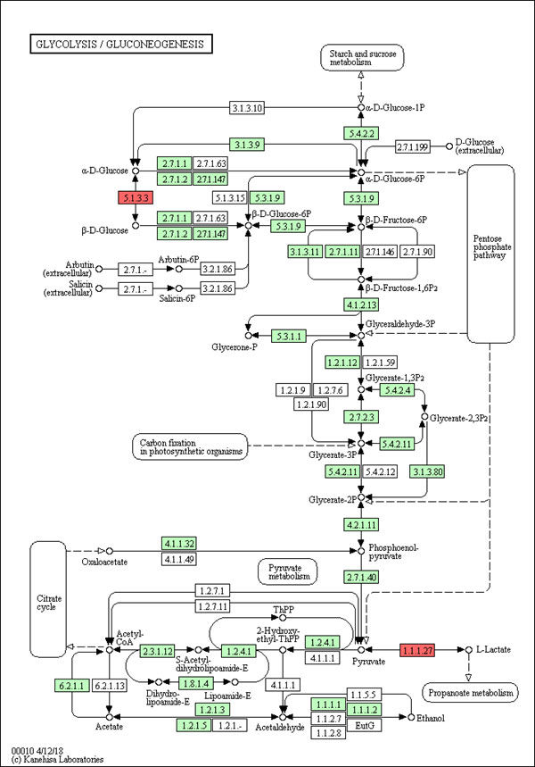 Pathway通路图展示与说明:红色代表注释到某个ko节点且上调的显著差异表达转录本,蓝色代表注释到某个ko节点且下调的显著差异表达转录本,橘黄色代表注释到某个ko节点不仅有上调又有下调的显著差异表达转录本。方框内的4位数字表示各种酶的EC编号;空心圆圈表示小分子化合物;实心箭头表示生化反应的方向;虚线箭头连接其他的相关代谢途径。下图仅为报告中的展示图片