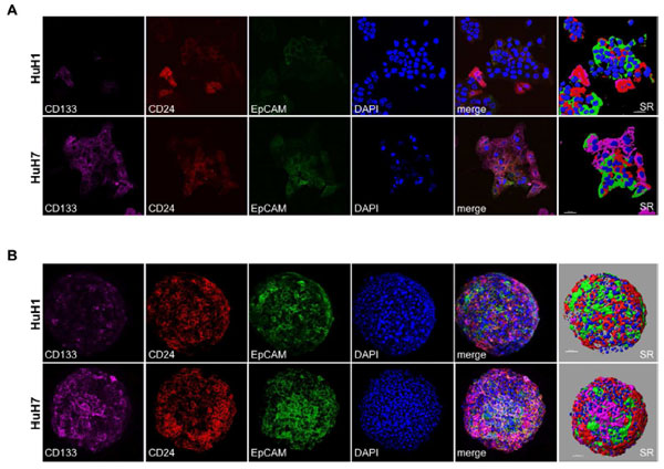 大量数据表明CD13、CD24、CD44、CD90、CD133、EpCAM等表面标志物可以定义CSC,研究人员选择CD24、CD133、EpCAM分选HuH1和HuH7不同细胞亚群,用于研究CSC生物学和分子水平异质性。免疫荧光染色表明,在两种细胞培养形态下(单层培养、球体培养),两个HCC细胞系均表现出明显的细胞异质性。