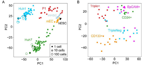 研究人员采用SMART-Seq方式分析HuH1和HuH7阳性标记细胞以及分选的P1(分选CD133+/CD24+/EpCAM+/CD45-细胞)细胞表达谱(单个细胞测序、10细胞混合测序、100细胞混合测序)信息,并与数据库中人胚胎干细胞(hESC)、鼠内皮细胞(mEC)和鼠造血干细胞(mHSC)表达谱数据做了比较,发现不同细胞类群具有不同的基因表达模式,且不同类型细胞中每个细胞的基因表达模式均存在差异,HuH7细胞间差异大于HuH1;当细胞混合(10细胞混合、100细胞混合)后这种差异程度明显降低(下图A)。而当单独聚类HuH7细胞时,发现不同标记细胞彼此可以区分(下图B)。以上数据均表明单细胞水平上转录组存在异质性。