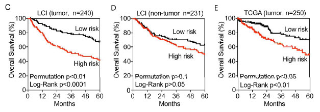 研究人员比较了HuH7阳性标记细胞(Triple+)和阴性标记细胞(Triple-)基因表达差异,鉴定到的286个Triple+相关基因可以预测来自LCI队列的240例肿瘤样本、来自TCGA的250例肿瘤样本的整体生存率,但在非肿瘤样本中无意义。