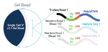 Gel beads在转录组测序中的作用是捕获细胞中的mRNA,每个微珠表面携带有几十万个Oligo序列(如下图)。Oligo dT序列由4个部分组成:read1用于上机测序;第二段是16bp 的10x barcode序列,每一个Gel Beads都携带不同的barcode , 可标记获取的mRNA都来自于哪一个细胞;第三段UMI长度为12bp, 可以将转录本序列进行绝对定量,避免扩增产生偏好;第四段是30bp的ployT,用于捕获有ployA尾的转录本。