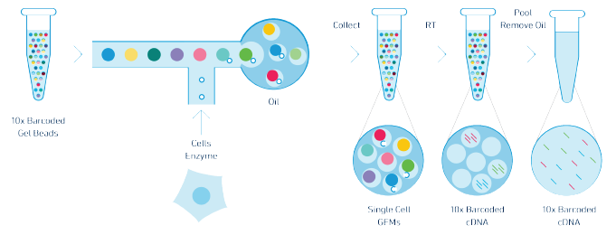 利用10x Genomics Chromium微流控系统,实现通过序列标签区别不同细胞和转录本。微流控系统通道直径很小一次通过一个细胞。首先在通道中加入带有标签的凝胶微珠,单个细胞和单个带有标签的凝胶微珠结合,二者被加入的油包裹到一个液滴中,形成油包水体系。凝胶微珠上带有大量包含凝胶微珠特异性Barcode序列、分子特异性UMI序列和polyT序列的引物序列,将细胞裂解后mRNA分子被引物序列中的polyT捕获,扩增后形成携带有Barcode和UMI序列的cDNA,即可实现将不同细胞来源的不同mRNA分子加上标签。