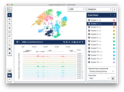 10X genomics公司提供的专门的分析结果查看软件-Loupe Cell Browser,该软件是一个图形界面的软件,操作非常的方便。可以用于以下应用:1.确定细胞类型: 使用可及性模式发现能够区分不同细胞类型和功能组别的启动子和转录因子motif;2.分析可及性差异: 使用ATAC Peak Viewer 定位具有假定调节功能的不同可访问基因组区域的位置;3.发现显著性特征: 创建自定义聚类并使用差异可及性分析工具精准识别数据中的细胞组别;4.共享数据结果: 保存感兴趣的信息,导出数据表,并获取单细胞ATAC数据的屏幕截图。