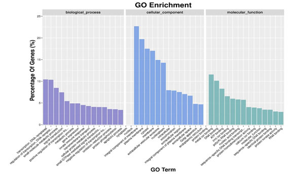 miRNA靶基因的GO富集柱状图:用于反映在生物过程(biological process)、细胞组分(cellular component)和分子功能(molecular function)富集的GO term上差异基因的个数分布情况。
