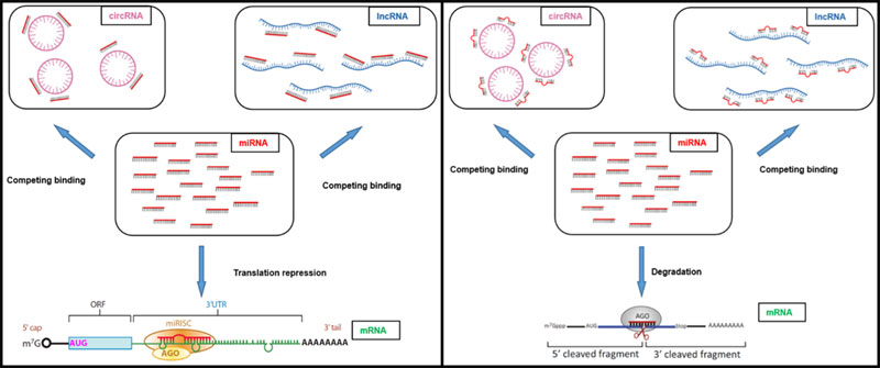 这些非编码RNA如lncRNA和circRNA等会竞争结合miRNA,导致miRNA调控的靶基因发生变化,最终体现在蛋白的表达水平上,而miRNA处于ceRNA调控网络中的核心地位。如下图