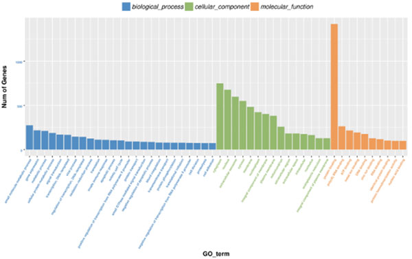GO富集性分析结果柱状图反映在生物过程(biological process)、细胞组分(cellular component)和分子功能(molecular function)富集的GO term上差异基因的个数分布情况。