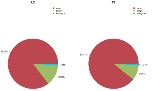 能够比对到参考基因组的Valid Data,依照参考基因组的区域信息,可以被定义为比对到exon(外显子)、intron(内含子)和intergenic(基因间隔区域)。正常情况下,Exon(外显子)区域的测序序列定位的百分比含量应最高,而比对到intron和intergenic区域的Reads,可能是由于前体mRNA(Pre-mRNA)的剪切事件、基因组注释不完整以及背景噪音等导致。