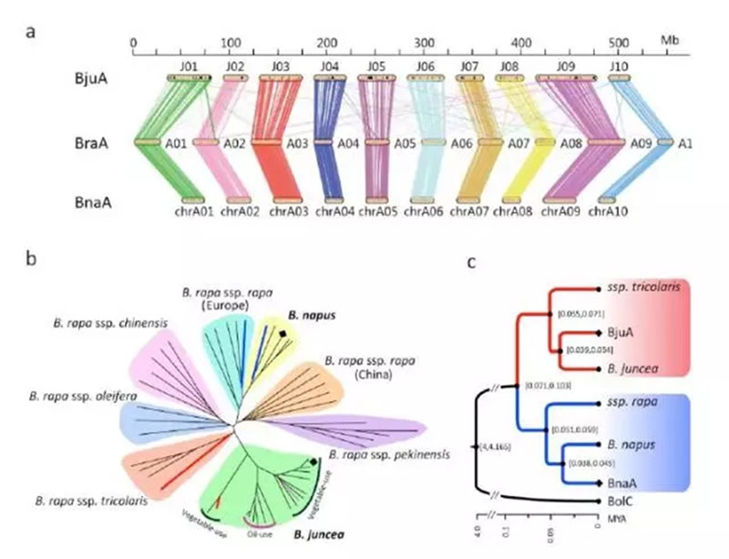 我们对10个菜用的芥菜、7个油用的芥菜,5个甘蓝型油菜基因组、27个白菜基因组(多亚种)进行了重测序分析,并绘制如上图b中的进化树。从b图中可以看到芥菜全部聚在一起,没有出现分散的情况,说明芥菜中A的基因组是来源于同一个亚种,属于单系起源。