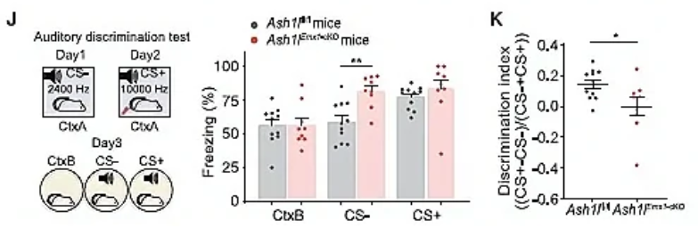 为了验证前脑神经元中Ash1l缺失是否会导致与Ash1l+/-小鼠类似的辨别能力障碍现象,作者借助Ash1lEmx1-cKO小鼠进行相关行为学范式,发现Ash1lEmx1-cKO小鼠与恐惧记忆相关的听觉辨别能力明显受损(图2J,K)。这种Ash1l突变小鼠的辨别能力异常符合部分ASD患者的临床表现。前脑Ash1l缺失可导致突触和神经环路功能障碍,以及辨别行为障碍。