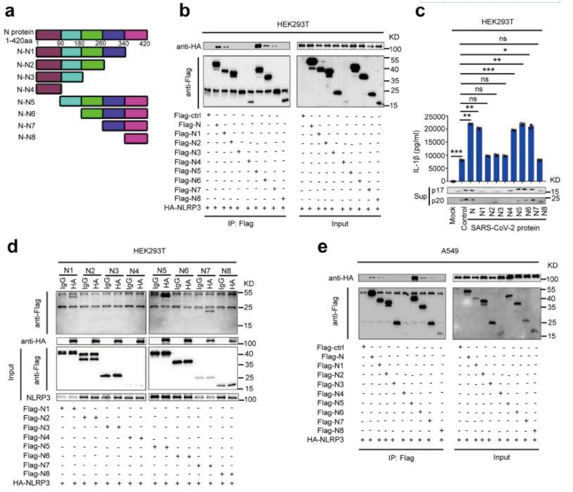 通过评估N蛋白的截短突变体N1-N8,鉴定参与NLRP3相互作用的CoV-2 N蛋白序列。结果表明,NLRP3蛋白与N1、N5、N6和N7相互作用,并且IL-1β分泌、IL-1β cleavage和Caspase-1 p20 maturation 亦受N蛋白N1、N5、N6和N7影响(Fig.4a-4e),因此,N蛋白260aa-340aa截短体参与了与NLRP3的相互作用并激活NLRP3炎症小体。