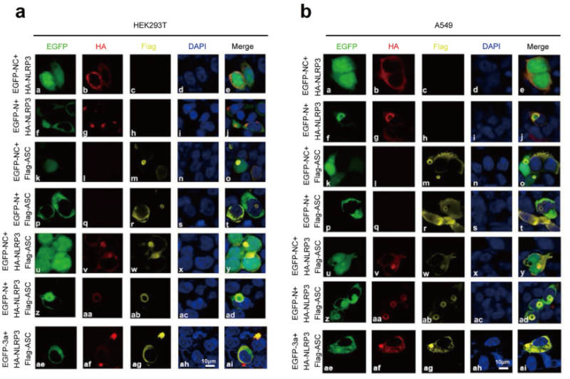 此外,研究人员还探究了N蛋白对NLRP3炎症小体复合物组装的影响。将HEK293T细胞或A549细胞共转染不同质粒,GFP同时分布于细胞核和细胞质中,NLRP3弥散状分布于细胞质(Fig.7a&7b(a-e));N蛋白和NLRP3表达时,NLRP3与N蛋白共定位,呈斑点状(Fig.7a&7b(f-j));GFP和ASC表达时,GFP与ASC同时分布于细胞核和细胞质中,并形成小的环状结构(Fig.7a&7b(k-o));N蛋白和ASC表达时,N蛋白和ASC无法共定位(Fig.7a&7b(p-t));GFP、ASC和NLRP3同时表达时,NLRP3和ASC共定位于细胞质并形成环状结构(Fig.7a&7b(u-y));值得注意的是,当N蛋白、ASC和NLRP3同时表达时,3种蛋白共定位形成球状结构(Fig.7a&7b(z-d));当3a、ASC和NLRP3同时存在时,3种蛋白共定位未能形成球状结构(Fig.7a&7b(ae-ai))。综上所述,CoV-2 N蛋白促进NLRP3炎性小体复合物组装,而非CoV-2 3a蛋白。