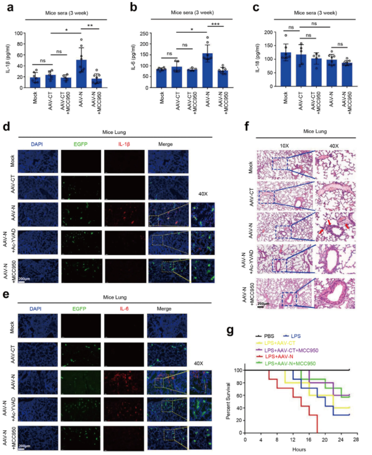 接下来,研究人员对CoV-2 N蛋白在激活NLRP3炎症小体的生物学作用进行评价。通过在C57BL/6小鼠表达N蛋白,探究N蛋白在肺损伤中的作用。注射AAVlung-N的小鼠,血清中IL-1β和IL-6的水平明显高于对照组,且Ac-YVAD-cmk和MCC950均可抑制该反应(Fig.8a&8b),但AAVlung表达N蛋白并未影响血清中IL-18的表达(Fig.8c)。AAVlung感染的小鼠肺部免疫荧光结果显示,AAVlung-N小鼠肺部IL-1β和IL-6表达明显高于其他分组,Ac-YVAD-cmk和MCC950均可降低IL-1β和IL-6表达(Fig.8d&8e)。HE染色显示,携带AAVlung-N的小鼠肺部有明显的的炎症病变及组织损伤,Ac-YVAD-cmk和MCC950均可抑制肺组织的病变(Fig.8f)。这些结果表明NLRP3炎性小体是N蛋白诱导的小鼠肺损伤发生所必需的。
