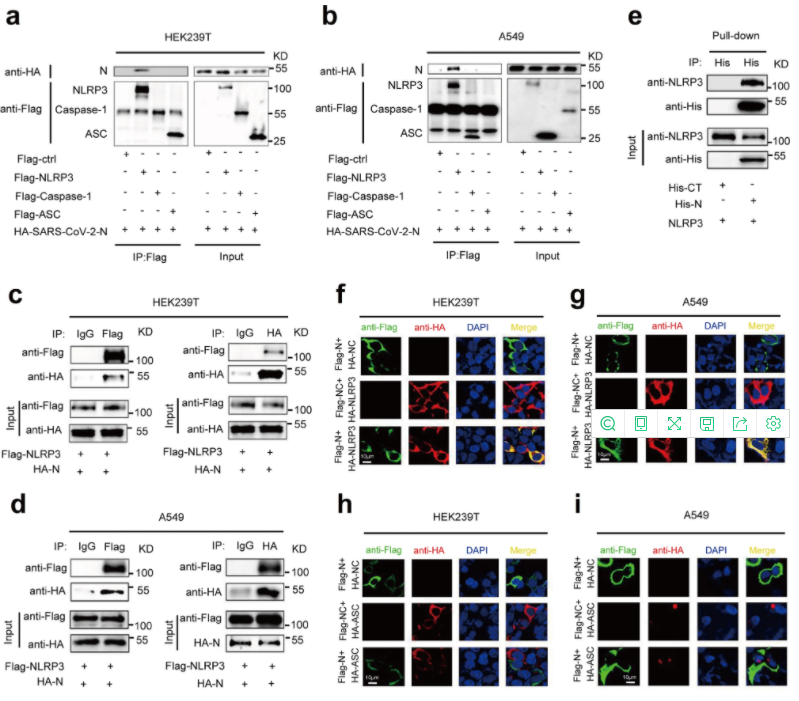 接下来研究者对CoV-2 N蛋白在NLRP3炎症小体调控中的作用进行研究。CO-IP结果显示,N蛋白仅与NLRP3蛋白相互作用,且His-N蛋白可以直接与NLRP3蛋白结合(Fig.3a-3e),N蛋白和NLRP3共定位于细胞质中,N蛋白与ASC无交互作用(Fig.3f-3i)。所以,N蛋白特异性与NLRP3蛋白相互作用,调节NLRP3炎症小体分泌。