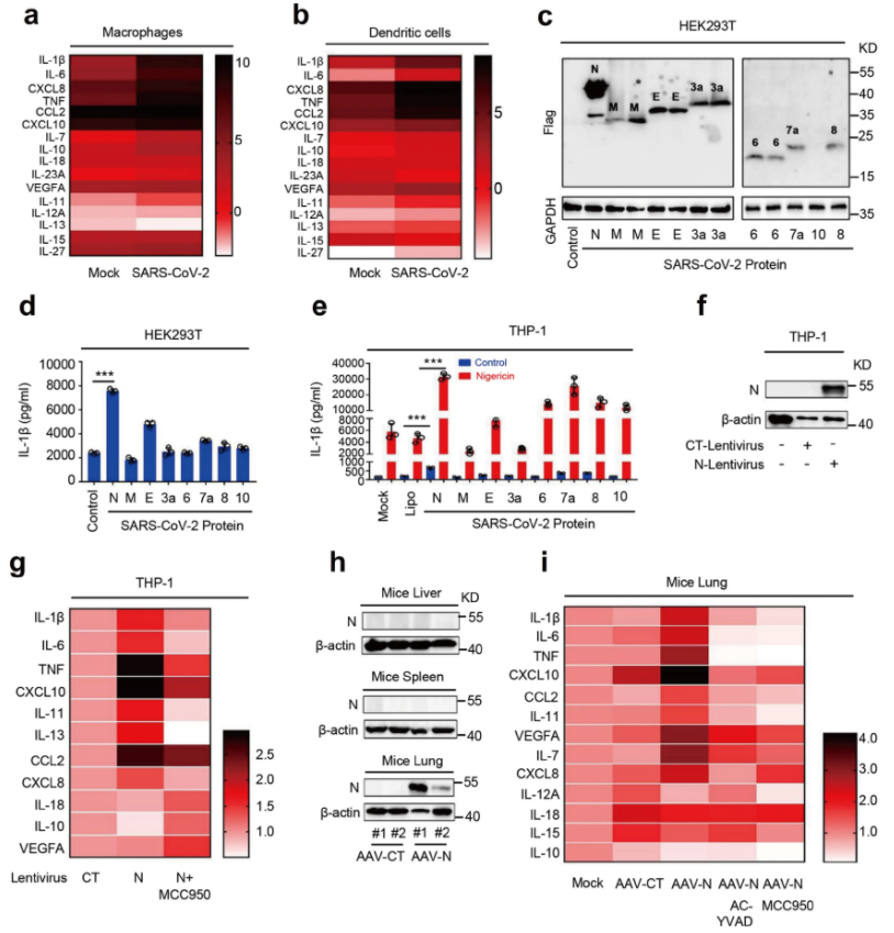 暨南大学吴建国教授/潘攀研究团队,在Nature子刊《Nature Communication》发表题为“CoV-2 N protein promotes NLRP3 inflammasome activation to induce hyperinflammation”(DOI: 10.1038/s41467-021-25015-6 ),该研究展示了CoV-2 N蛋白通过促进NLRP3炎症小体激活诱导高炎症反应;N蛋白促进促炎因子的成熟,并诱发细胞和小鼠的促炎反应;N蛋白直接与NLRP3蛋白相互作用,促进NLRP3与ASC结合,促进NLRP3炎症小体组装;N蛋白加重脓毒症和急性炎症小鼠模型中肺损伤,加速死亡,促进小鼠IL-1β和IL-6激活。