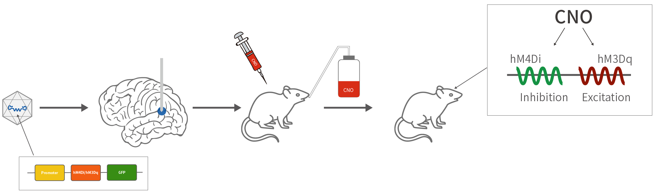 Gi耦合的GPCRs可以激活G蛋白内向整流钾通道(GIRK),在CNO的作用下, hM2Di和hM4Di受体被激活可以抑制神经元的放电活动,其中使用最多的Gi-DREADD是hM4Di。也有研究表明,hM4Di可以抑制神经递质的释放,从而达到抑制神经元活动的效果。