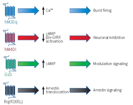 最初的Gq-DREADD即hM3Dq,改造自人毒蕈碱型乙酰胆碱受体(the human muscarinic acetylcholine receptor,mAchRs)亚型M3(也称为hM3)。在正常生理状况下,hM3和乙酰胆碱结合,然后和Gq类G蛋白耦合受体耦合,作用于磷脂酶C、肌醇三磷酸和胞内钙离子这一信号通路。
