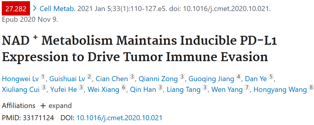 [5] Hongwei Lv, Guishuai Lv., et al. (2021). NAD + Metabolism Maintains Inducible PD-L1 Expression to Drive Tumor Immune Evasion. Cell Metab.2021 Jan 5;33(1):110-127.e5.doi: 10.1016/j.cmet.2020.10.021.