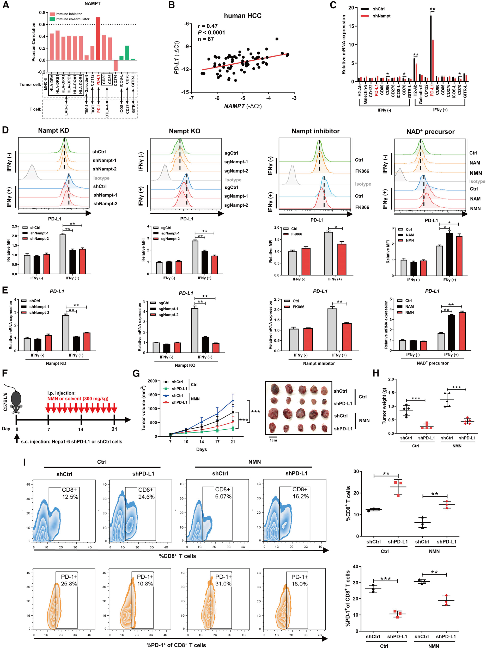烟酰胺腺嘌呤二核苷酸(NAD+)是能量代谢和信号转导途径的重要中介[1],除了在氧化磷酸化和氧化还原反应中的功能外,NAD+还作为许多酶的底物,并参与许多生物过程,如DNA修复、炎症和蛋白质乙酰化[2]。烟酰胺磷酸核糖基转移酶(NAMPT)是NAD+合成途径的限速酶,NAMPT和NAD+在几种人类恶性肿瘤中经常上调,并在肿瘤的起始、进展和复发中发挥关键作用[3]。然而,NAMPT介导的NAD+代谢在调控肿瘤免疫逃逸中的作用尚不清楚。
