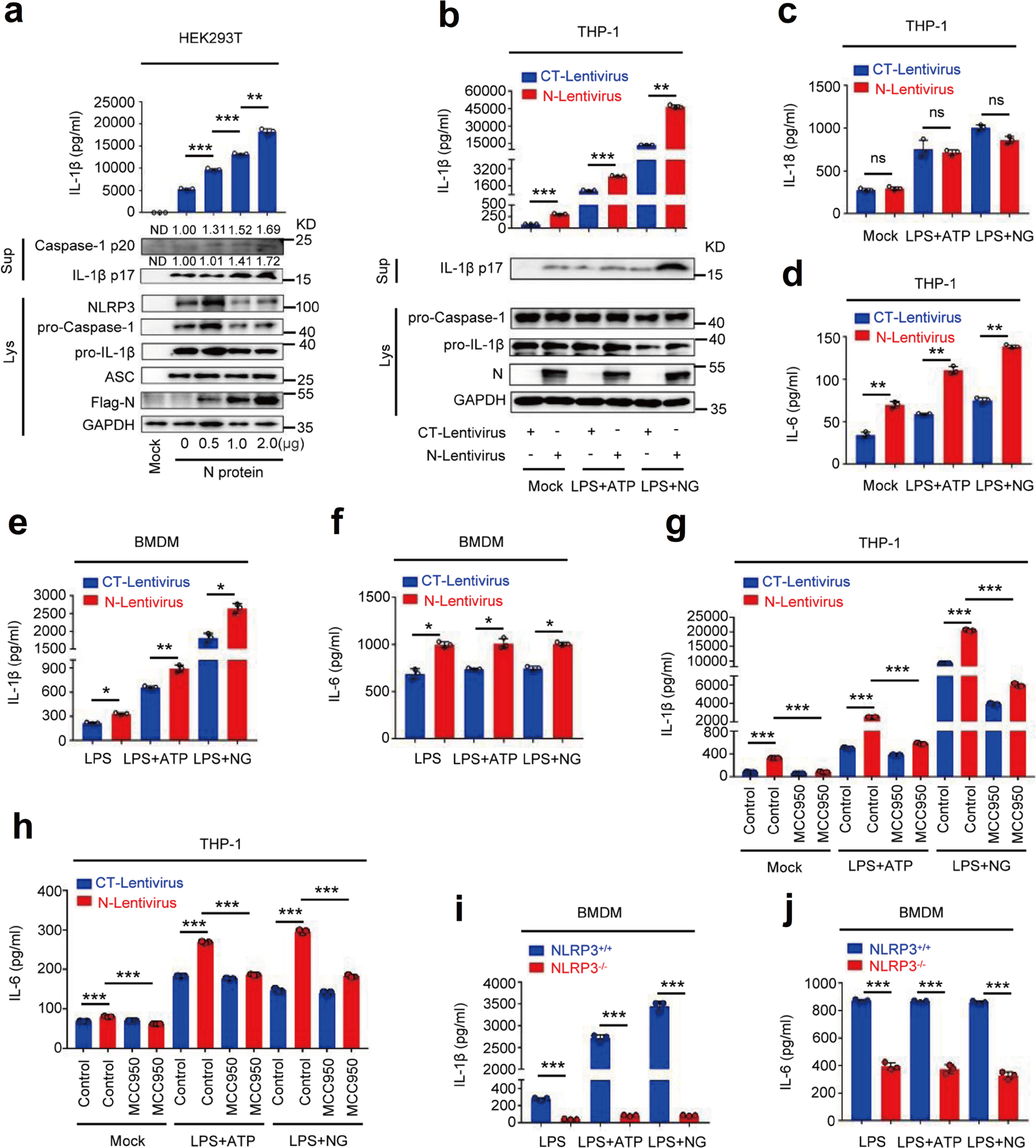 接下来研究人员对N蛋白在调节NLRP3炎症小体成分中的作用进行研究。结果显示,N蛋白对NLRP3、Caspase-1和ASC的蛋白水平没有影响,然而NLRP3存在时N和ASC可以相互免疫沉淀(Fig.5a-5e)。因此,该结果提示N蛋白、NLRP3和ASC三个蛋白可能形成一个复杂的N-NLRP3-ASC复合物。N蛋白增强NLRP3与ASC的相互作用在HEK293T和A549细胞并呈剂量依赖(Fig.5f-5g)。同样,在PMA-differentiated THP-1-N细胞中,Nigericin促进 N蛋白在NLRP3存在的情况下与内源性ASC相互作用(Fig.5h)。因此,SARS-CoV-2 N 促进NLRP3与ASC的相互作用。