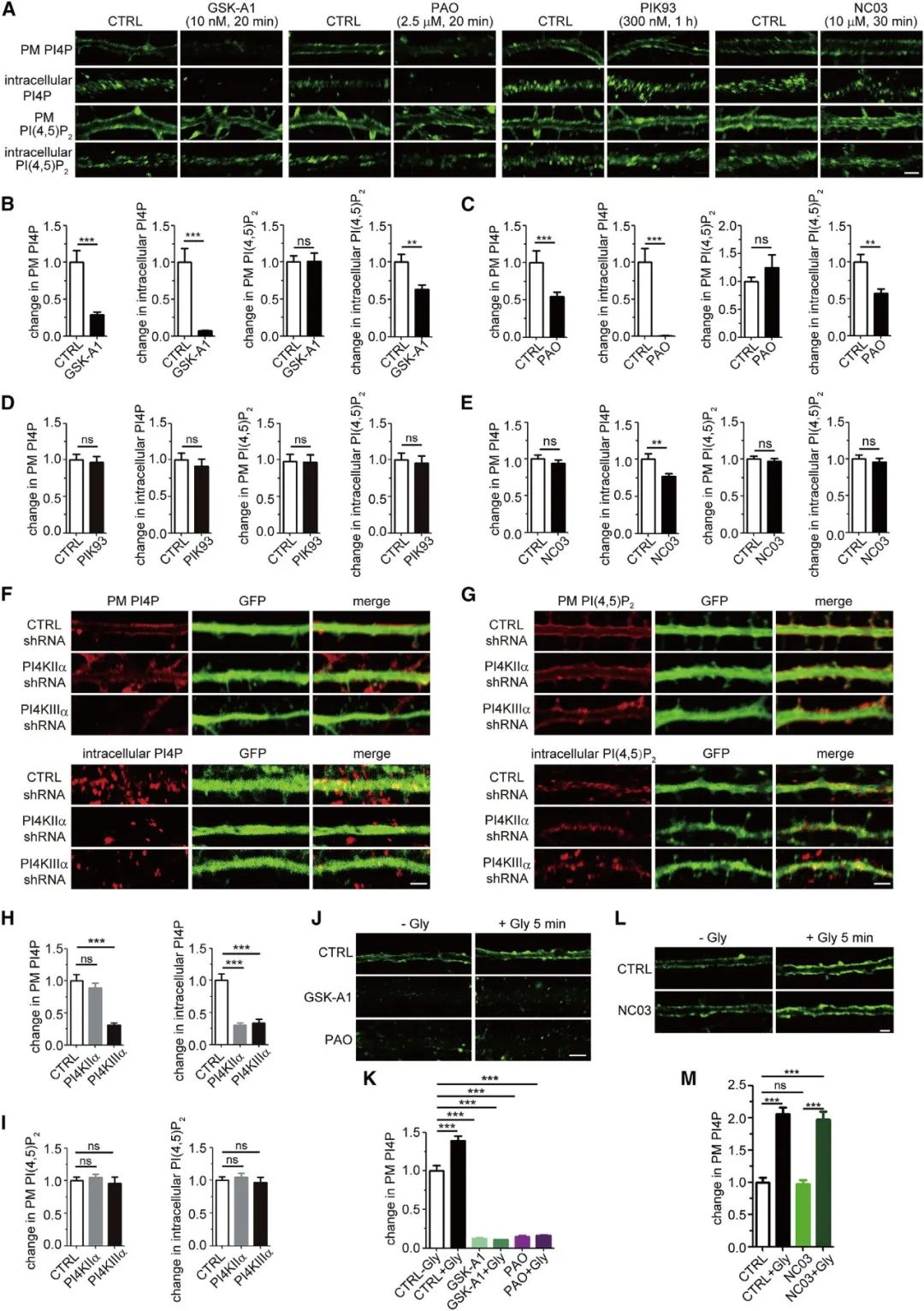 基于上述结果,作者假设PI4P参与了活动依赖的突触后成分的膜转运(如AMPA将受体转运至突触位点上),为了验证该假说,首先需要调控PI4P在胞膜或细胞内膜上的含量。以PI为底物,共有四种激酶可以将其磷酸化为产物PI4P,其中PI4KIIIa被认为参与了PI4P在胞膜中的合成和维持。借助化学抑制剂或AAV介导的shRNA表达载体(pAKD-CMV-bGlobin-eGFP-H1-PI4KIIIa shRNA),研究者在海马神经元中抑制PI4KIIIa的活性或表达。结果显示,抑制PI4KIIIa可导致树突胞膜中PI4P缺失。进一步地,在化学诱导LTP的过程中急性给予PI4KIIIa抑制剂可以阻止胞膜上PI4P水平的瞬时性上升。这些结果提示了,在神经元树突胞膜上,PI4KIIIa既与PI4P静息状态下的含量相关,也参与了活动依赖的PI4P合成过程。(图3)。