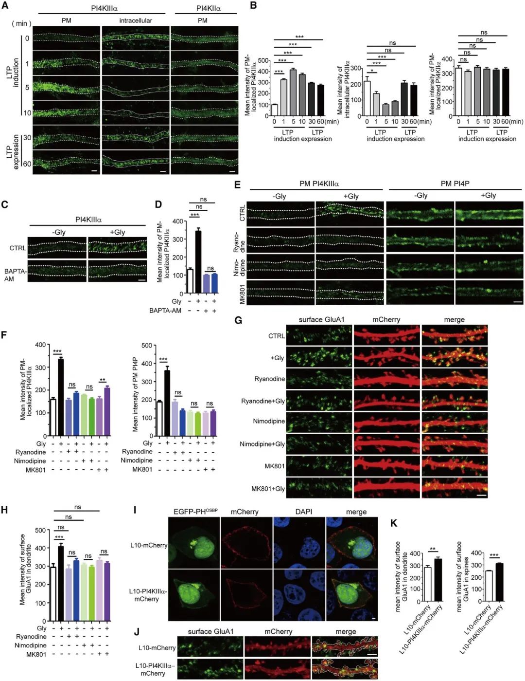 随后,研究人员进一步发现CICR(钙诱导的钙释放)促进了PI4KIIIa在LTP期间从细胞质到细胞膜表面募集,进而介导了PI4P的合成,促进AMPAR亚基GluA1在细胞膜上的运输(图4)。