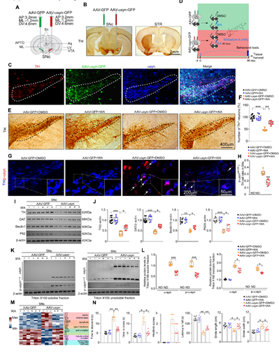 本文中除了采用经典的药物诱导帕金森动物模型之外,为了模拟人类帕金森患者从早期到晚期病情逐渐加深这一时间进程,研究者将携带了人类α-突触核蛋白(human α- synuclein,h-αsyn)的腺相关病毒(adeno-associated virus,AAVs)AAV2/9-hsyn-αsyn-GFP注射在小鼠的一侧黑质(图2A)。组织学结果表明病毒注射后21天即可观察到α-突触核蛋白在黑质的TH阳性(TH是酪氨酸羟化酶,是多巴胺神经元的分子标志物)神经元中表达。α-突触核蛋白的过表达导致了黑质区多巴胺能神经元的丢失,并对动物的运动功能造成了损害。蛋白质印迹实验显示,WA处理后小鼠脑组织中不溶性α-Syn和磷酸化的α-Syn(p-α-syn)含量相比溶剂对照处理均表现出下降趋势。WA处理同时降低了黑质多巴胺神经元的丢失,并减轻了动物的运动损伤症状。