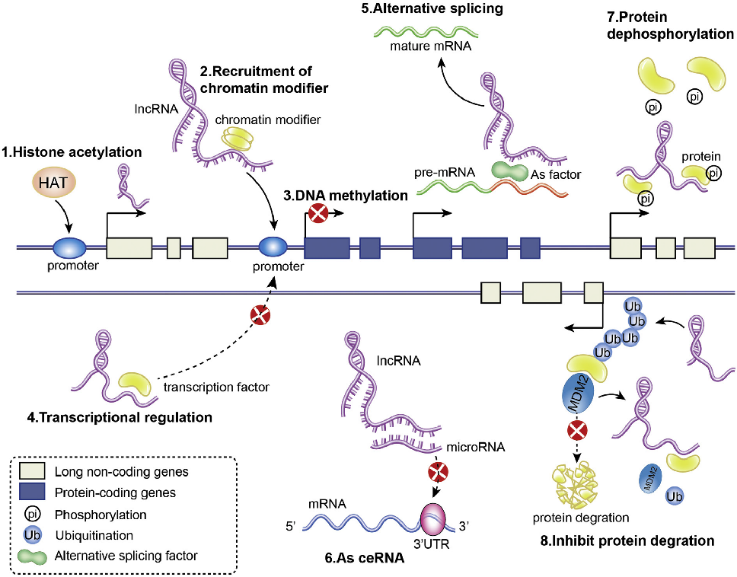 由于lncRNA的复杂性和多样性,不能简单地根据其结构或序列来描述其功能,但lncRNA的一个重要作用是调节邻近蛋白编码基因的表达。LncRNA在不同水平上调节基因表达: