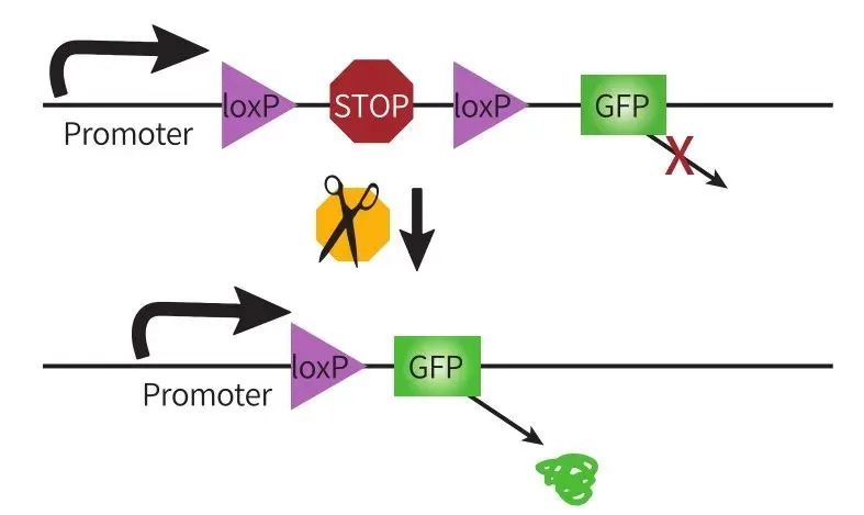 Cre-LoxP系统可以实现对基因的操控,根据Cre重组系统诱导基因重组的方式,我们可以通过如下三种策略实现Cre依赖的基因表达: