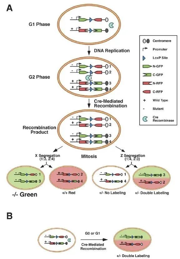 双标记嵌合体分析MADM(mosaic analysis with the double markers)系统,是基于Cre诱导发生Translocation过程实现的。通过同源重组将两个相互嵌合的标记基因(荧光蛋白)分别定位到同源染色体上的相同位点,位于同一条DNA链上的荧光蛋白N端(C端)和另一种荧光蛋白N端(C端)之间插入一个Loxp位点。在没有Cre的情况下,不表达功能性的GFP或RFP;但在特定时期、特定细胞中表达Cre时,Cre能诱导带有两种不同荧光蛋白N端的DNA链与另一条带有相同荧光蛋白C端的DNA链在细胞有丝分裂G2期发生重组,使得两个子代细胞分别表达有任一种有功能性的荧光蛋白(称为:X-segregation),或者其中一个子代细胞表达两种荧光蛋白而另一种子代细胞不带任何功能性荧光蛋白(称为:Z-segregation)。另外,重组也可能发生在细胞周期的G1期或者G0期,在这种情况下,细胞同时表达两种荧光蛋白。