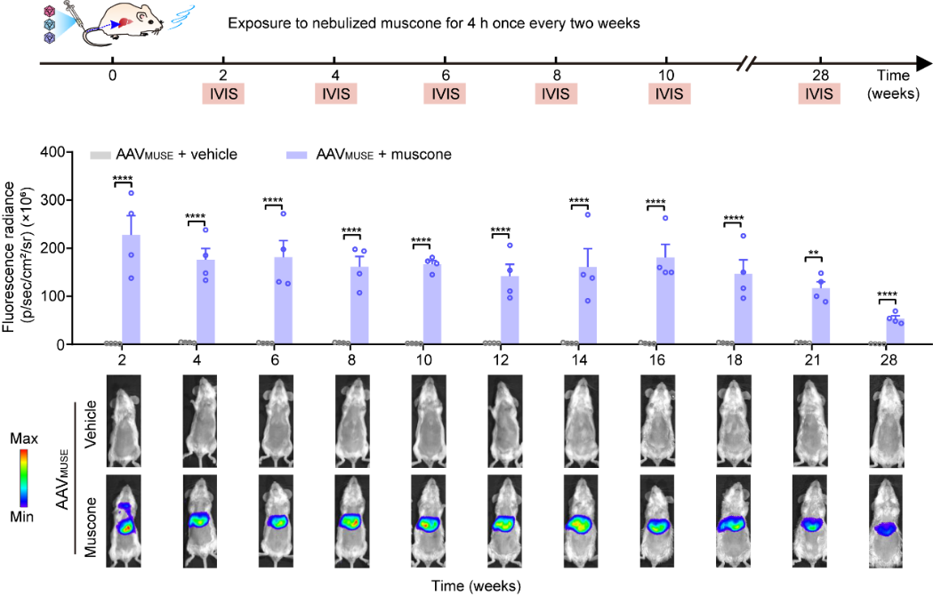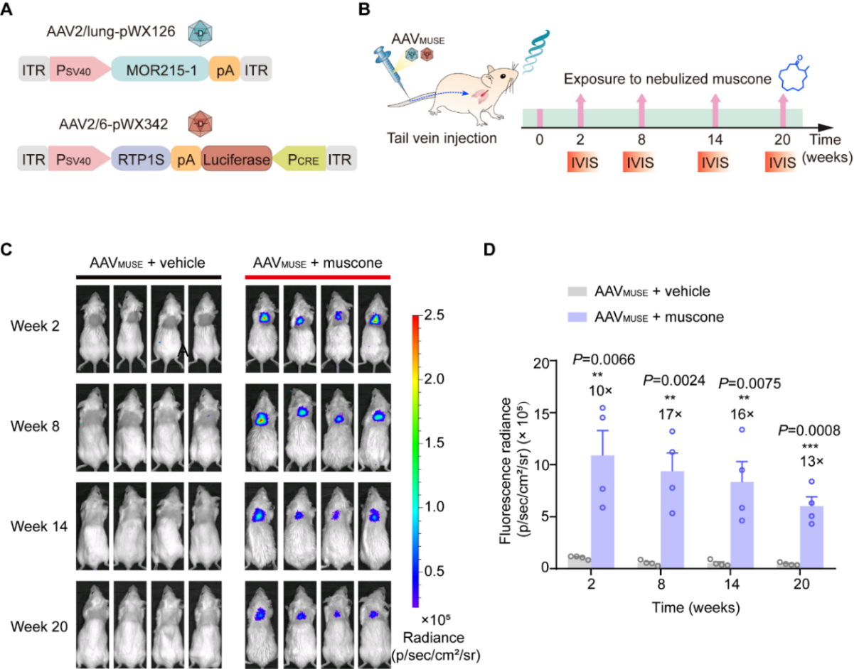 因此我们将麝香酮调控基因环路装载在AAV病毒载体中,设计构建了AAV介导的麝香酮调控的基因环路(AAVMUSE),利用AAV的多器官靶向性将该环路转导至肝脏或肺部,通过定期“闻香”实现长期精准控制蛋白药物的表达释放(图3和图4)。