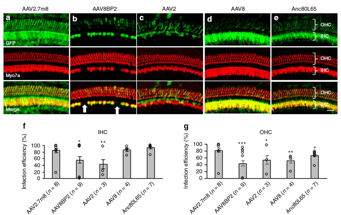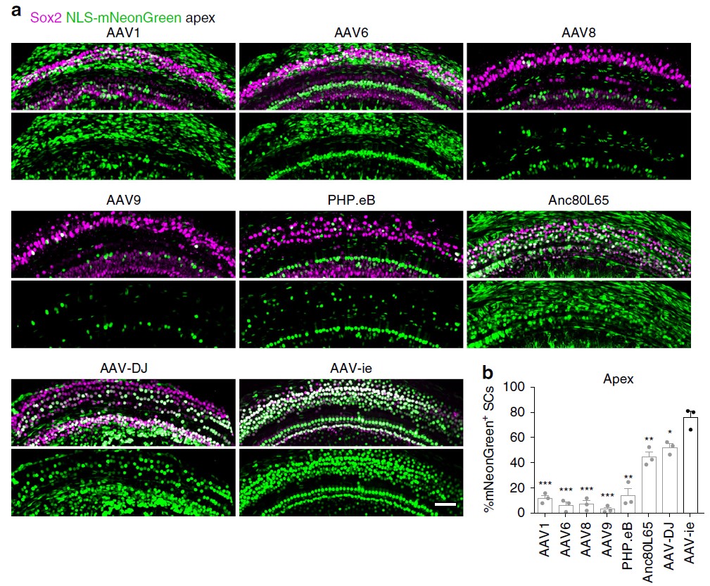 2019年及2022年由上海科技大学钟桂生课题组及其合作者开发的AAV-ie及AAV-ie-K558R血清型可以高效感染内耳各种类型细胞,包括OHCs, IHCs, SCs, SGNs和其他耳蜗细胞及前庭细胞,其中对于SCs的感染率显著高于其他AAV血清型。