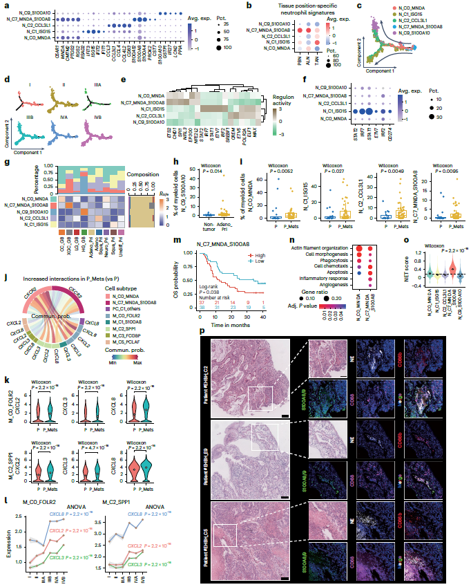 对单核细胞、巨噬细胞、中性粒细胞进行重聚类,之后通过差异表达分析、SCENIC、基因特征评分及Ro/e分析,识别出了5种具有不同功能的细胞亚型,如N_C0_MNDA、N_C1_ISG15、N_C2_CCL3L1、N_C7_MNDA_S100A8、N_C9_S100A10(图 2a–g)。值得注意的是,伪时间分析表明,N_C0_MNDA 和 N_C7_MNDA_S100A8 是最先被招募的中性粒细胞亚型(图 2c、d)。根据临床诊断将Adeno_Pri(原发性腺癌)分为Adeno_Pri (P)和转移性Adeno_Pri (P_Mets),并发现几乎所有常见的中性粒细胞亚型在 P_Mets 组中均显著增多(图 2h、i)。