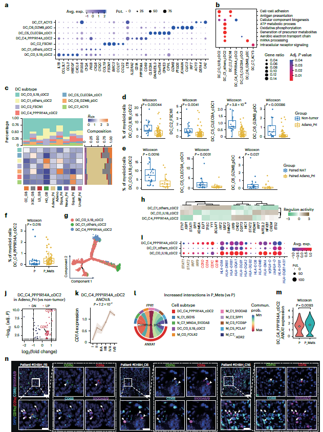 将 13,571 个树突状细胞分为八个亚群,其中七个常见细胞亚群被用于后续分析(图 1e)。大部分DC亚型在Adeno_Pri中减少(图 3a-e)。DC_C4_PPP1R14A_cDC2 在 P_Mets 组中最丰富(图 3f)。DC_C4_PPP1R14A_cDC2 是脂质抗原呈递 DC 细胞,且CD1A 在疾病进展中表现出显著增加(图 3g-k)。细胞间互作分析显示,DC_C4_PPP1R14A_cDC2 通过 ANXA1-FPR1与髓系亚型(尤其是 M_C1_S100A8)相互作用(图 3l,m)。CODEX验证了这两个亚型在空间上彼此靠近,表明 DC_C4_PPP1R14A_cDC2 可能通过 ANXA1-FPR1 招募 M_C1_S100A8(图 3n)。这些结果表明 DC_C4_PPP1R14A_cDC2 具有脂质抗原呈递细胞的特性,DC_C4_PPP1R14A_cDC2 可能通过 ANXA1–FPR1 招募 M_C1_S100A8。