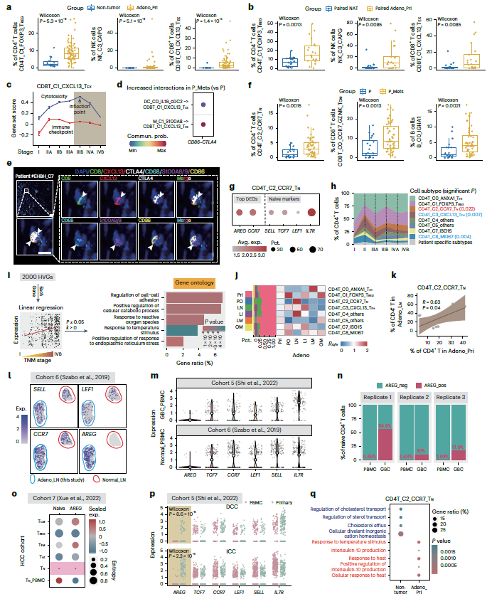 此外,发现富集于 P_Mets 的 CD4T_C2_CCR7_TN 细胞高表达 AREG 和Naive标志物(IL7R)(图 4f、g)。随着疾病的发展,Adeno_Pri 中 CD4T_C2_CCR7_TN 的 AREG 表达和比例逐渐增加,同时伴有与 TNM 分期相关的动态功能变化(图 4h、i)。在不同类型的转移中,CD4T_C2_CCR7_TN 在 Adeno_LN 中最为常见,AREG 的表达仅在腺瘤性淋巴结中被检测到(图 4j-l)。AREG 仅在胃癌、肝内胆管癌和远端胆管癌naive CD4+ T cells中表达(图 4m-p)。GO富集分析表明IL-10 信号通路在CD4T_C2_CCR7_TN中上调,表明可能调节免疫激活(图 4q)。综上所述,CD4T_C2_CCR7_ TN在P_Mets富集,其特征是 AREG 高表达。