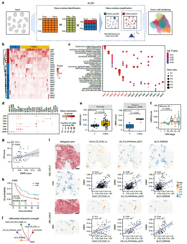 为了识别肿瘤细胞亚型,作者提出了一种名为 AI-EPI 的计算方法(图 6a)。获取了七个患者共有的基因模块(GMs,如GM8、GM1、GM16、GM5、GM3、GM7、GM6),并基于共有的 GMs 将肿瘤细胞分为了不同的细胞状态(图 6b–d)。进一步分析发现 GM16 在 P_Mets 中得分更高,在 IIIB 期中得分最高(图 6e、f)。肿瘤异质性与 GM16 得分也表现出强相关,GM16高得分样本表现出不良预后(图 6g、h)。