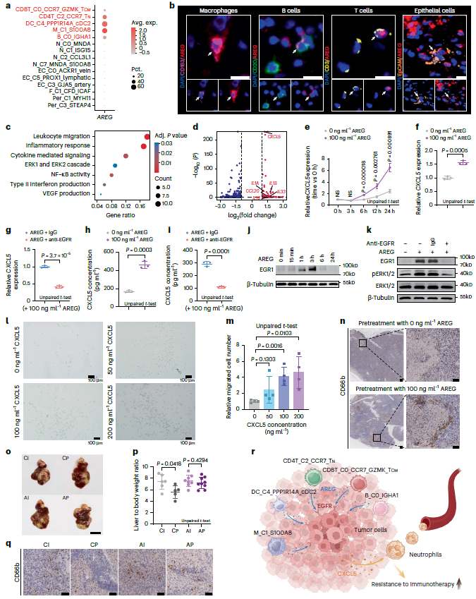 进一步发现 AREG 仅在与 GM16 接近的细胞亚型中表达(如CD8T_C0_CCR7_GZMK_TCM、 CD4T_C2_CCR7_TN、DC_C4_ PPP1R14A_cDC2、M_C1_S100A8 和 B_C0_IGHA1),而在远离 GM16 的内皮细胞、成纤维细胞和中性粒细胞亚型中未表达(图 7a)。AREG 不仅在巨噬细胞、B 细胞和 T 细胞中表达,还在上皮细胞中表达(图 7b)。为了进一步探究在 AREG 刺激下肿瘤细胞的功能变化,对AREG 处理的 GBC-SD 细胞进行RNA-seq分析,发现CXCL5 显著上调(图 7c-e)。鉴于 AREG 是 EGF 家族的一员,因此推断 AREG 可能 EGFR 调节 CXCL5 的表达。湿实验结果表明anti-EGFR处理抑制了这一效应(图 7f-i)。此外,体内外实验证实,AREG 不仅促进肿瘤转移,还通过EGFR-pERK-EGR1 信号通路上调肿瘤细胞 CXCL5 的表达,招募中性粒细胞浸润,进而削弱免疫治疗(如 PD-L1 抗体)的疗效(图 7l-r)。这些结果表明,AREG 通过 EGFR–pERK–EGR1上调CXCL5来促进胆囊癌转移。