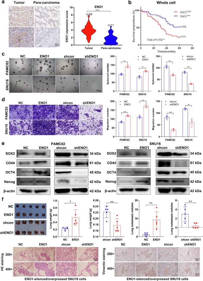探讨ENO1在胃癌(GC)中的表达情况,作者使用人胃癌组织芯片进行免疫组织化学(IHC)分析。与癌旁正常组织相比,胃癌组织中ENO1的核质表达均显著升高(图1a)。此外,对特征均衡的胃癌患者进行ENO1表达分层生存分析显示,高ENO1表达患者的生存率显著低于低表达患者(图1b),且在核ENO1低表达患者中,胞质ENO1表达水平也影响生存。随后作者使用慢病毒构建PAMC82和SNU16细胞系的ENO1差异表达细胞模型,发现ENO1上调对细胞增殖无显著影响,但促进球形成(图1c)、迁移(图1d)、侵袭能力以及干性因子表达(图1e),而ENO1敲低(shENO1)胃癌细胞则呈现相反趋势。此外作者建立了小鼠模型,发现高ENO1表达显著增加肺转移并导致肺重量增加。由于转移结节过多,可能导致肺功能受损、系统性缺氧,进一步影响整体代谢和生理功能,最终导致裸鼠体重略微下降(图1f)。综上,这些结果表明高ENO1表达可能与胃癌患者不良预后及胃癌细胞干细胞样特性相关。